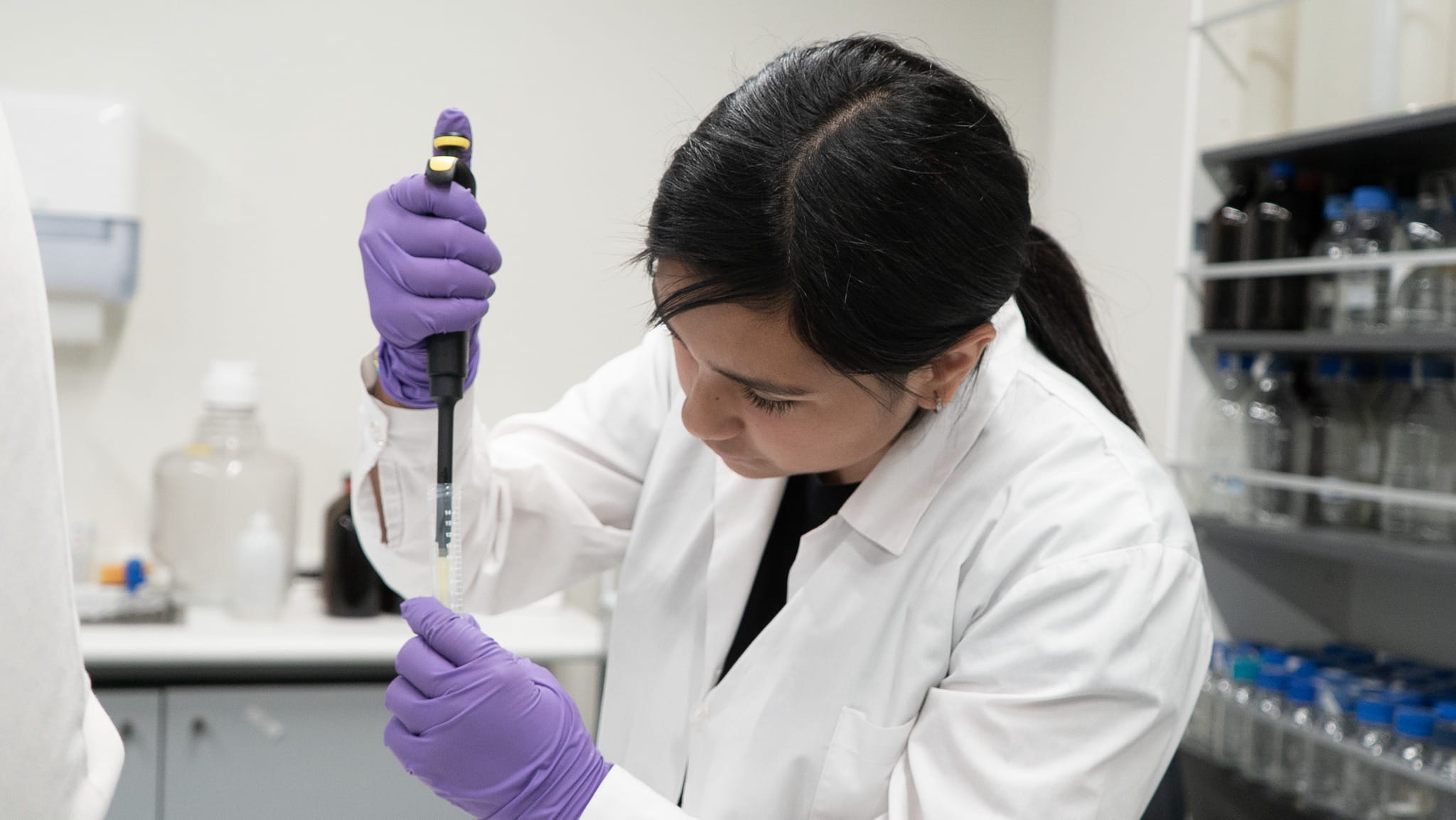 La visita fue guiada por Pascuala Valdivia González, estudiante del Doctorado en Biología Celular y Biomedicina de la Universidad San Sebastián, quien compartió conocimientos y mostró cómo la ciencia se transforma en innovación dentro de nuestros espacios de investigación. Para ello, utilizó como ejemplo un estudio que está en curso sobre algunos efectos del extracto de boldo.